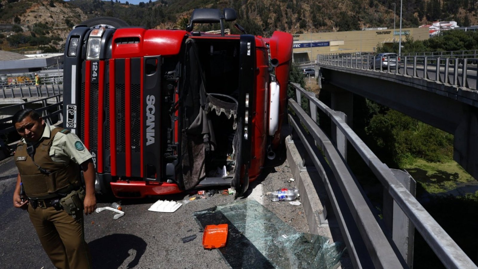Debido a esta situación, el camión terminó derramando gran cantidad de vino y aceite de motor en la calzada, los cuales llegaron hasta el estero abajo del puente.