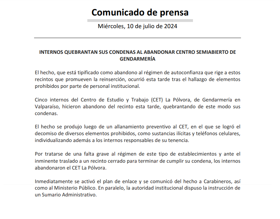Asimismo, detallaron que inmediatamente, “se activó el plan de enlace y se comunicó del hecho a Carabineros, así como al Ministerio Público. En paralelo, la autoridad institucional dispuso la instrucción de un Sumario Administrativo”.
