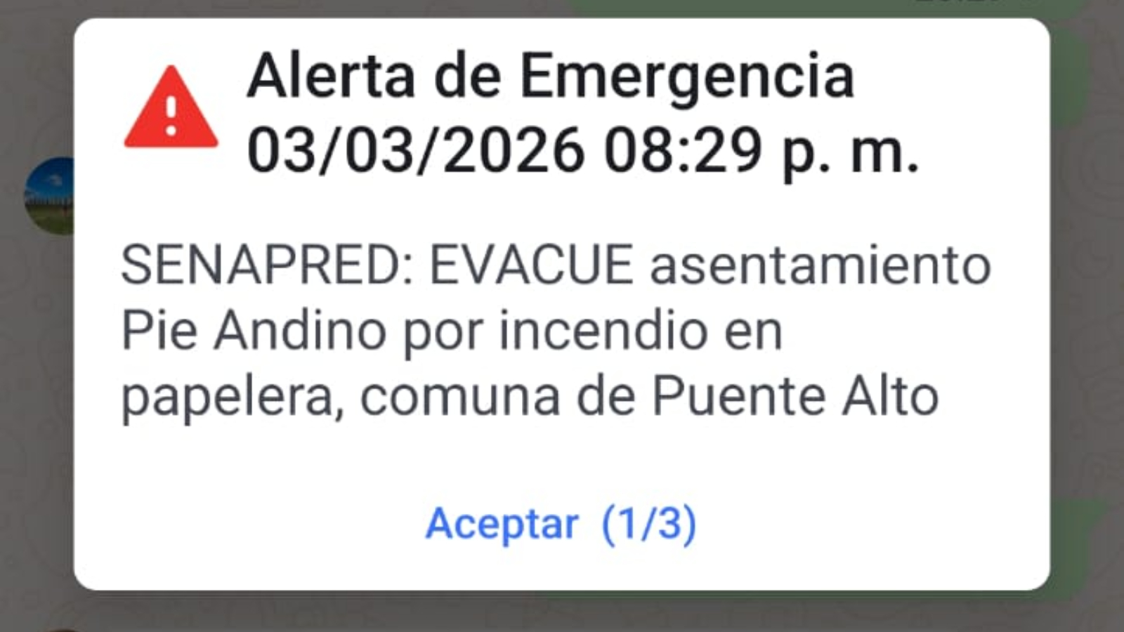 "Senapred: EVACUE asentamiento Pie Andino por incendio en papelera, comuna de Puente Alto".