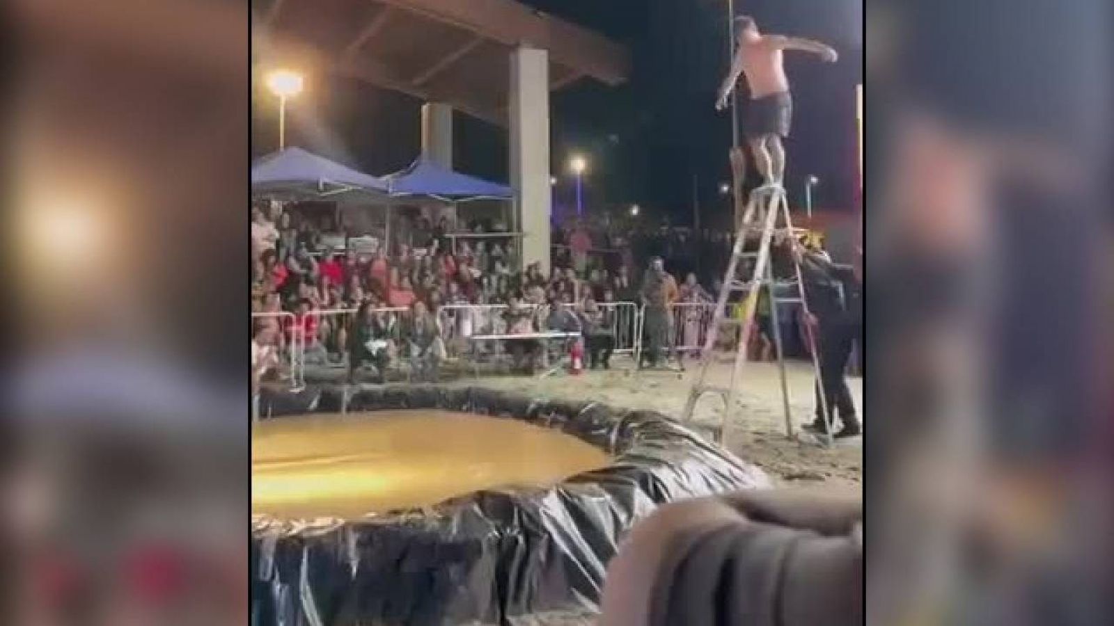 Fue bajo ese contexto que un hombre se tiró desde una escalera metálica hacia una piscina de barro con el objetivo de hacer "guatazo". Sin embargo, se golpeó en la cabeza y quedó inconsciente durante varios minutos.