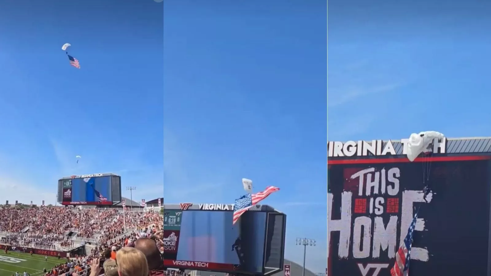 Un tenso momento se vivió al inicio de un partido de fútbol americano durante este sábado en el estadio Lane de Virginia Tech luego que un paracaidista con una bandera de Estados Unidos quedará sobre la pantalla gigante del marcador de la cancha.