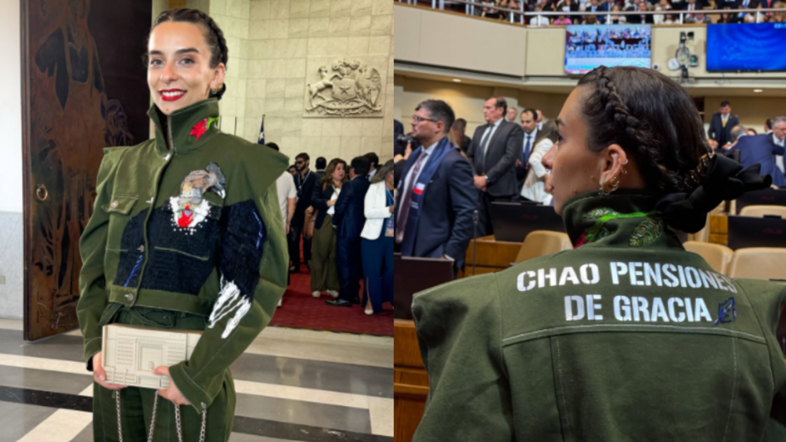 El traje, de color verde olivo, incluía un cóndor bordado en el pecho, copihues en el cuello y la frase “chao pensiones de gracia” en la espalda. La propia parlamentaria explicó el simbolismo de su vestimenta: “¡Lo hice yo! Lo bordé. Tiene un cóndor en el pecho y copihues en el cuello de inspiración militar. Cóndor porque representa orden y libertad, y copihues porque es feminidad y tradición. El traje es verde olivo en honor a mis padres carabineros”.