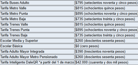 “Las nuevas tarifas comenzarán a regir a partir de las 00:00 horas del domingo 22 de febrero de 2026, salvo en el caso del Dale QR, cuyo nuevo monto comenzará el 1 de marzo”, indicó el comunicado entregado.