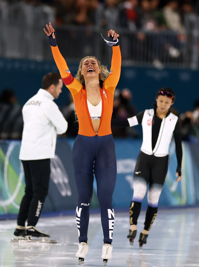 Leerdam, visiblemente emocionada por el triunfo, se bajó la cremallera de su traje y dejó ver un peto deportivo blanco de la marca Nike, una acción que habría generado un fuerte beneficio económico para la patinadora.