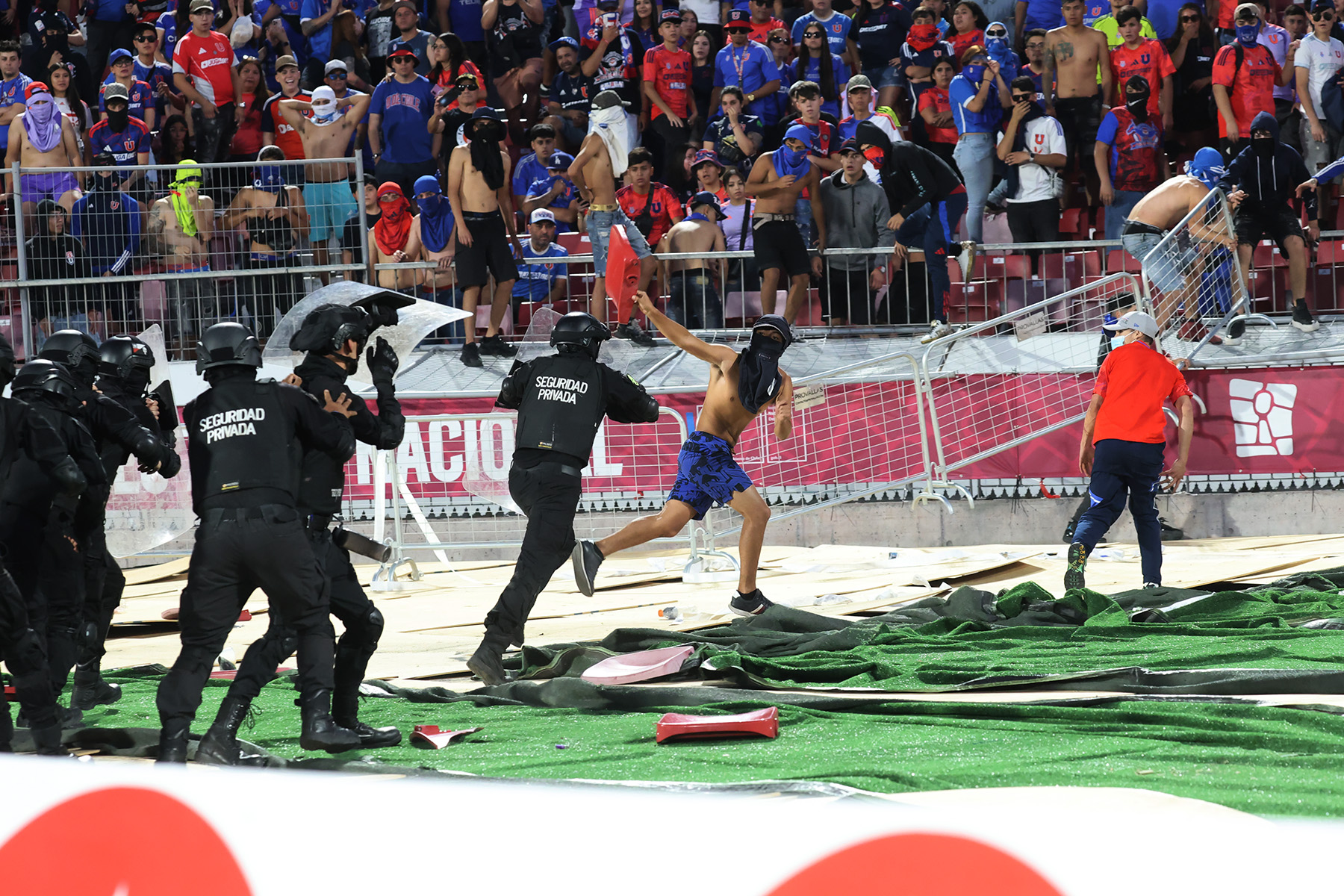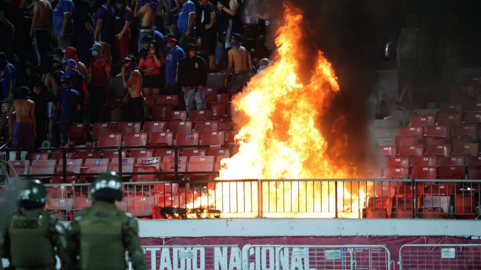 Un grupo de barristas azules comenzaron a destruir y prender fuego las butacas del coloso, además, destruyeron distintas partes del inmobiliario de Ñuñoa, específicamente en el sector de las puertas 14, 15 y 16.