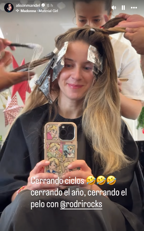 "Cerrando ciclos, cerrando el año, cerrando el pelo con @Rodrirocks", comenzó contando Mandel mientras se sometía al trabajo de su peluquero.
