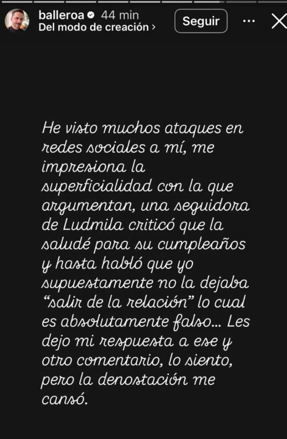 "He visto muchos ataques en redes sociales a mí, me impresiona la superficialidad con la que argumentan, una seguidora de Ludmila criticó que la saludé para su cumpleaños y hasta habló que yo supuestamente no la dejaba 'salir de la relación' lo cual es absolutamente falso... Les dejo mi respuesta a ese y otro comentario, lo siento, pero la denostación me cansó", expresó en sus redes.