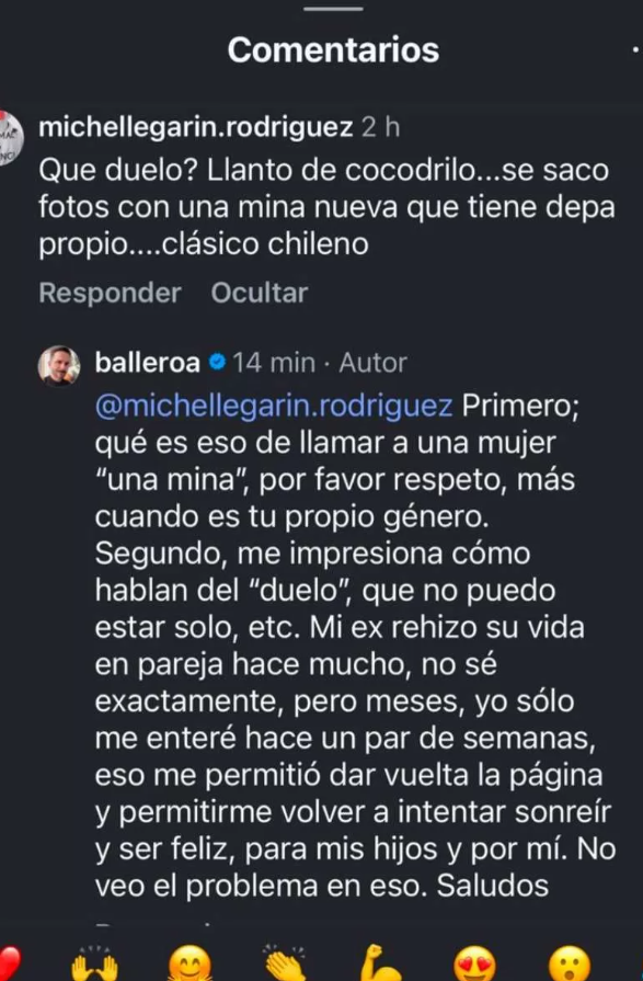 "Qué duelo? Llanto de cocodrilo...se sacó fotos con una mina nueva que tiene depa propio....clásico chileno", comentó la seguidora.