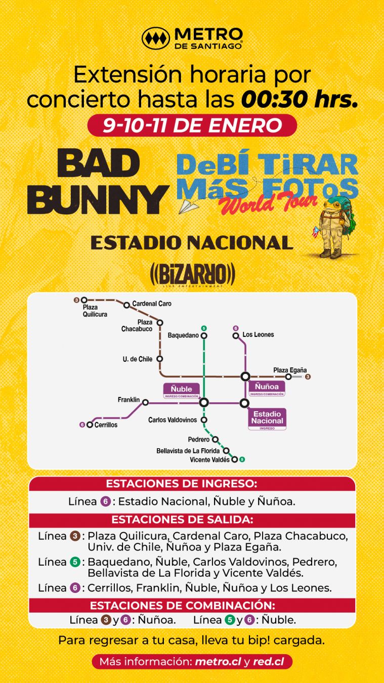 Este viernes 9, sábado 10 y domingo 11 de enero el Estadio Nacional verá la llegada de cientos de fanáticos que disfrutarán el concierto de Bad Bunny en Chile, cuyo show provocará modificaciones en el horario del Metro de Santiago.