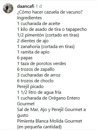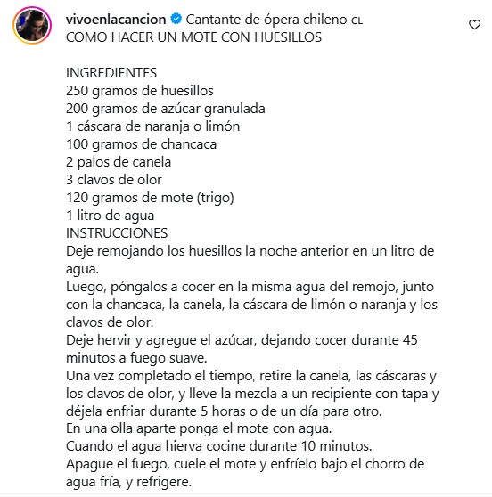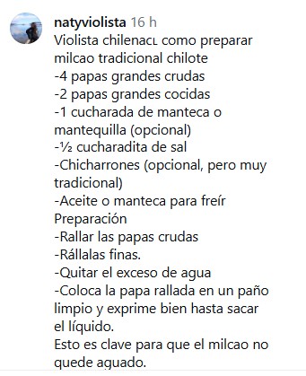 Los comentarios en las publicaciones de su Instagram rápidamente se llenaron de profesionales y seguidores de estas artes escénicas, entre los que, por supuesto, destacaron las ya clásicas recetas chilenas.