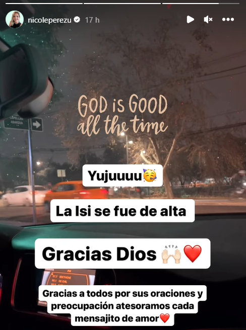 Pese a las complicaciones anteriormente explicadas, Nicole, actualizó el estado de salud de su hija y escribió, "la Isi se fue de alta. Gracias Dios, gracias por todas sus oraciones y preocupación, atesoramos cada mensajito de amor".