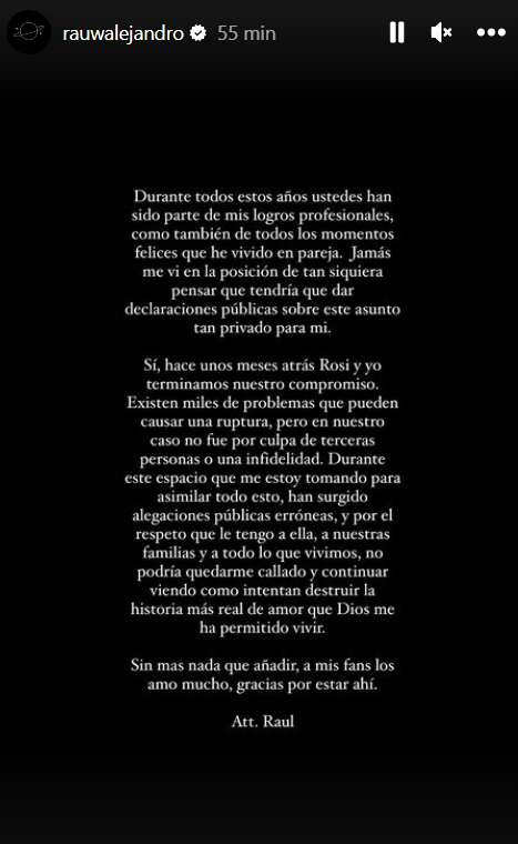 A través de su cuenta de Instagram, Rauw Alejandro le envió un mensaje a sus fans para aclarar la situación. "Durante todos estos años ustedes han sido parte de mis logros profesionales, como también de todos los momentos felices que he vivido en pareja. Jamás me vi en la posición de tan siquiera pensar que tendría que dar declaraciones públicas sobre este asunto tan privado para mí", escribió.