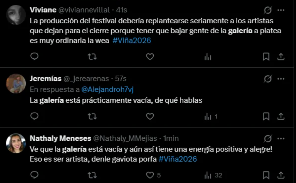 Esta salida masiva de espectadores generó notorios espacios vacíos en el sector de la galería, alterando el marco de público habitual del certamen.