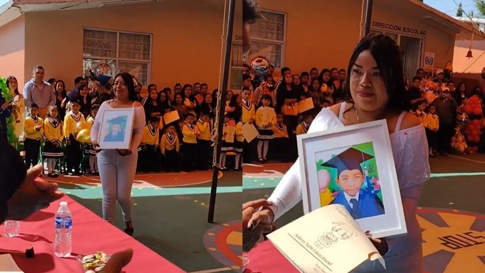 En medio de eso, Yareli avanzó entre la multitud presente portando una fotografía de su hijo, quien falleció a causa de una neumonía meses atrás. Posteriormente se acercó a las autoridades del colegio para recibir el diploma de graduación entre emotivos aplausos.