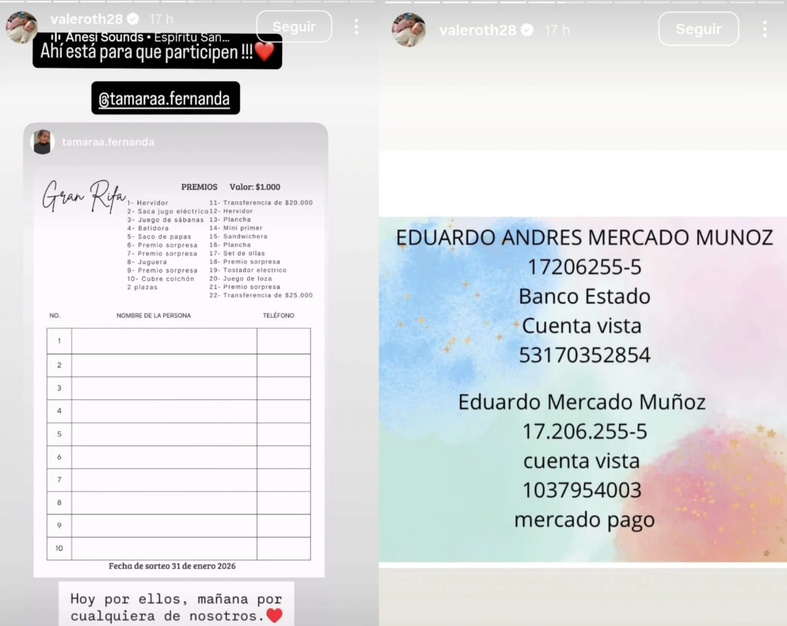 En ese contexto, informó que la familia organizará una rifa solidaria para reunir recursos, además de habilitar una cuenta bancaria para recibir aportes directos de quienes deseen colaborar. Valentina Roth señaló que se sumará activamente a esta iniciativa, comprometiéndose a difundirla y a reunir más ayuda para el grupo familiar.