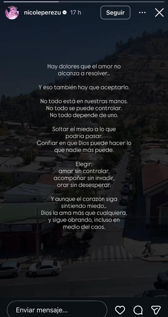 "Elegir: amar sin controlar, acompañar sin invadir, orar sin desesperar. Y aunque el corazón siga sintiendo miedo... Dios la ama más que cualquiera, y sigue obrando, incluso en medio del caos", finalizó en el mensaje cargado de fe y vulnerabilidad ante la angustiante situación.