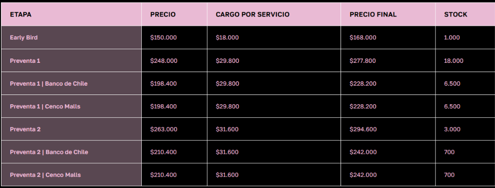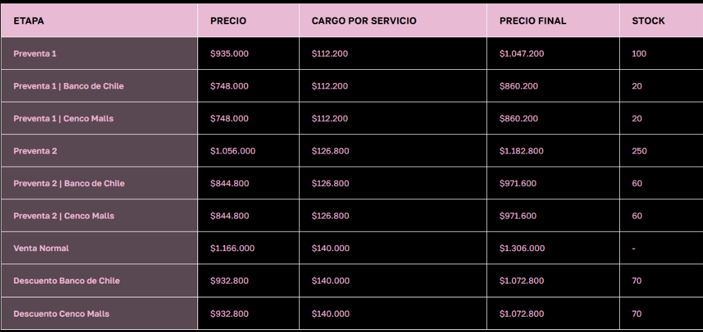 Los precios van desde $860.200 en preventa Banco de Chile/Cenco Malls hasta los $1.306.000 en la venta normal.