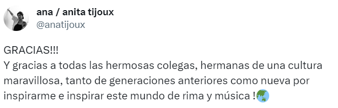 Sobre la rapera nacional destacan que "rompió barreras como rapera en un género predominantemente masculino, cuando la presencia femenina era más rara (...) El flow feroz pero melifluo de esta poeta franco-chilena transmite un espíritu irreverente que no ha hecho sino empoderar, resonando con el público global".