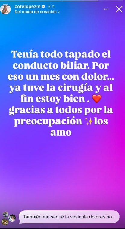"Tenía todo tapado el conducto biliar. Por eso un mes con dolor... Ya tuve la cirugía y al fin estoy bien. Gracias a todos por la preocupación, los amo", escribió en una historia de su Instagram.