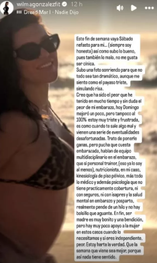 Por este motivo, detalló que no solo son preocupaciones médicas, dolores y cambios físicos e inestabilidad emocional, sino que también los gastos que se suman en el embarazo: "En fin, ser madre es muy bonito y una bendición, pero hay muy poco apoyo a la mujer en estos casos cuando lo necesitamos y, si eres independiente, peor. Estoy harta, la verdad. Que la semana que viene sea mejor, porque así nada tiene sentido".