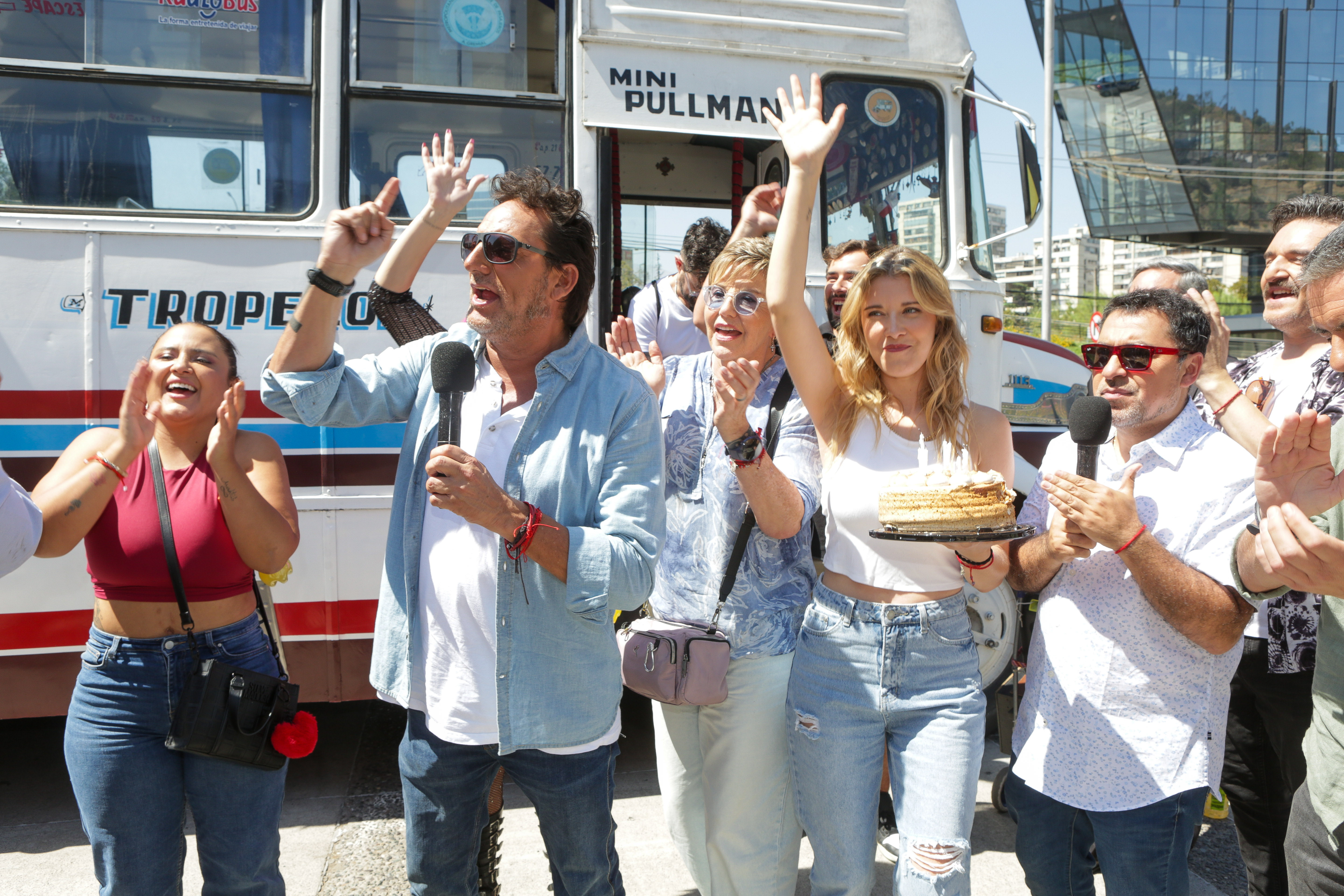 Tras ese momento, el equipo abordó una clásica micro que se transformó en el escenario móvil de la celebración. En ella esperaban compañeros y rostros que han sido parte del programa, incluidos algunos ganadores de la competencia Medio Talento, espacio que semana a semana ha descubierto a artistas de distintos rincones del país. A lo largo del trayecto se fueron sumando panelistas y figuras que han marcado este primer año: el Profe, Pamela Leiva, Paulina Nin, Carla Jara, Lucas Nervi y el reportero Nicolás Gutiérrez, entre otros. Todos han sido piezas clave del espacio matinal de "El Medio Día" que busca diferenciarse del resto, apostando por la entretención, la cercanía y las historias positivas.