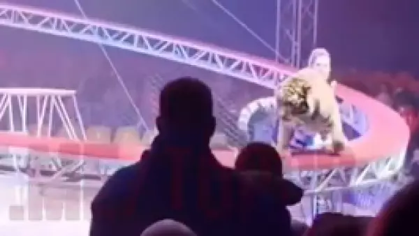 Lunes 20 de abril de 2026 Saltó hacia el público: Tigre genera el pánico en circo de Rusia El gran felino aprovechó un error de la malla de seguridad para saltar hacia los asientos del público durante un espectáculo.
